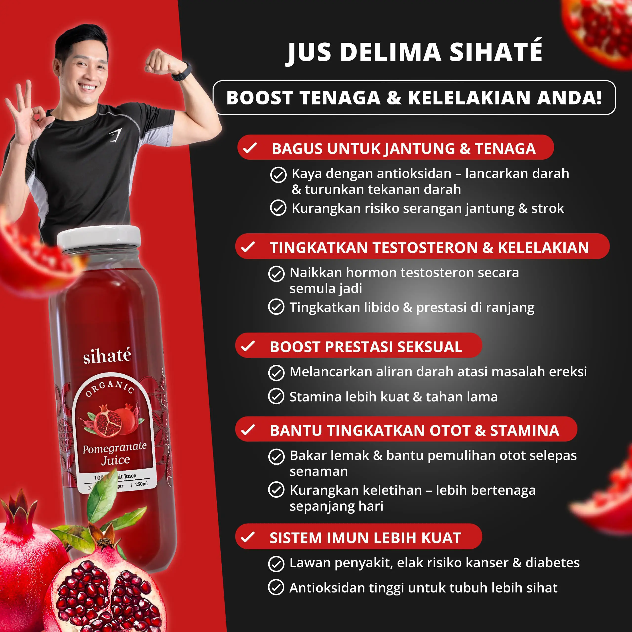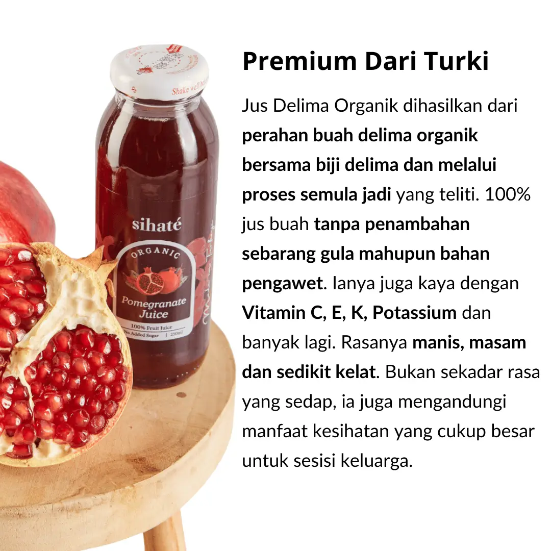 Kualiti Jus Sihaté dijaga seawal dari pemilihan buah lagi sehingga jus dibotolkan. Proses yang terlibat memakan kos yang tinggi supaya Jus yang sedap, tinggi vitamin dan mineral yang tinggi dapat dihasilkan. Antara faktor yang terlibat ialah, pemilihan buah Delima Organik sahaja yang akan dipilih. Buah tersebut akan diperah di kilang yang memiliki standard ISO 9001 dan 22000 untuk memastikan Jus yang diperolehi bersih, selamat dan berkualiti tinggi. Seterusnya Jus akan menjalani dua kali ujian makmal bagi mengesahkan keaslina Jus iaitu dalam dan luar negara.
