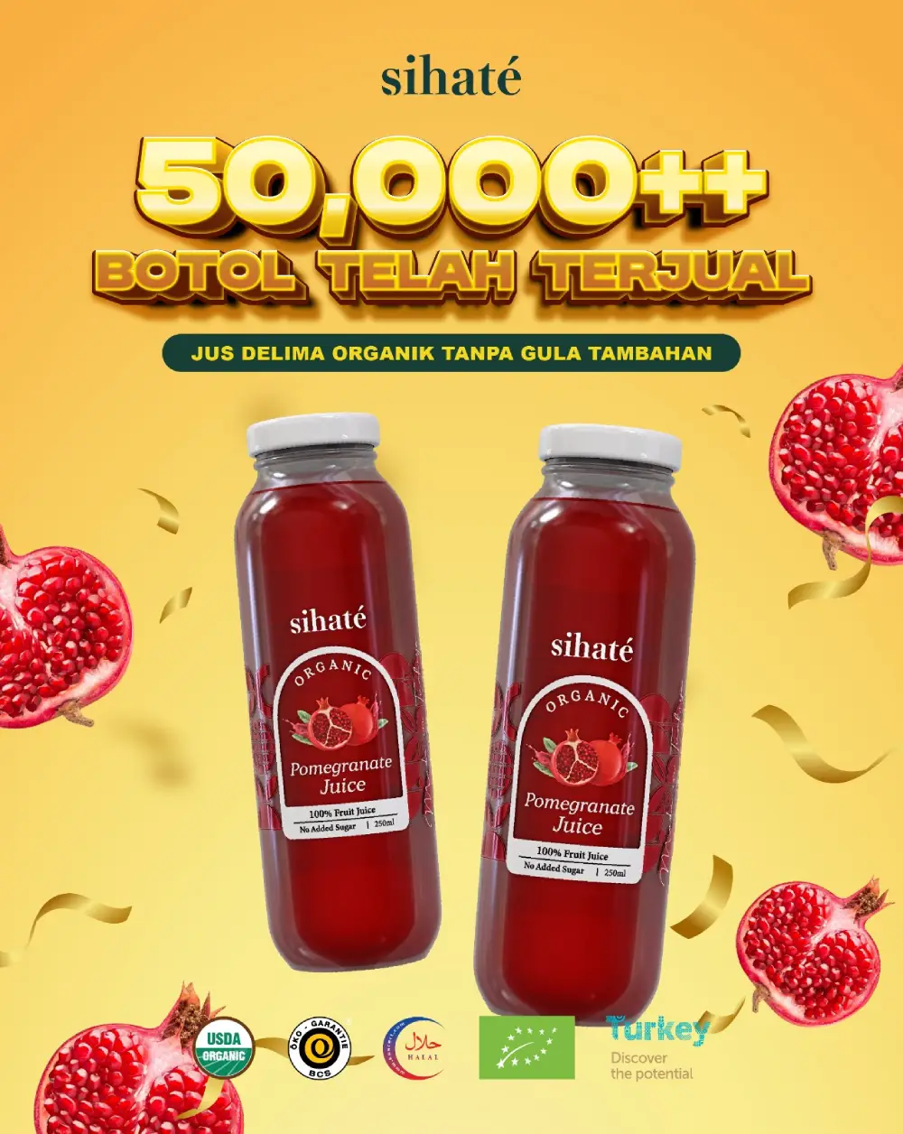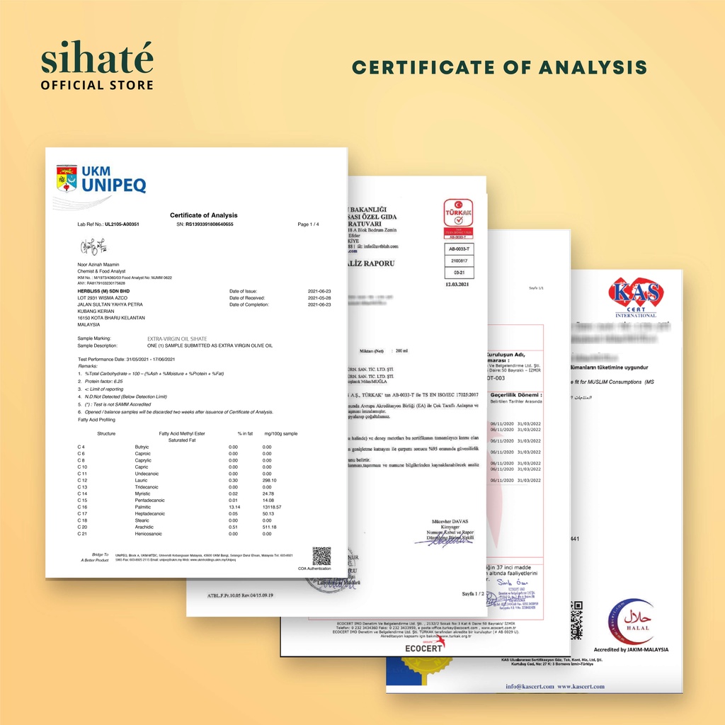 Semua produk keluaran Sihaté adalah asli dan organik tanpa sebarang campuran pewarna, pengawet dan bahan-bahan lain.