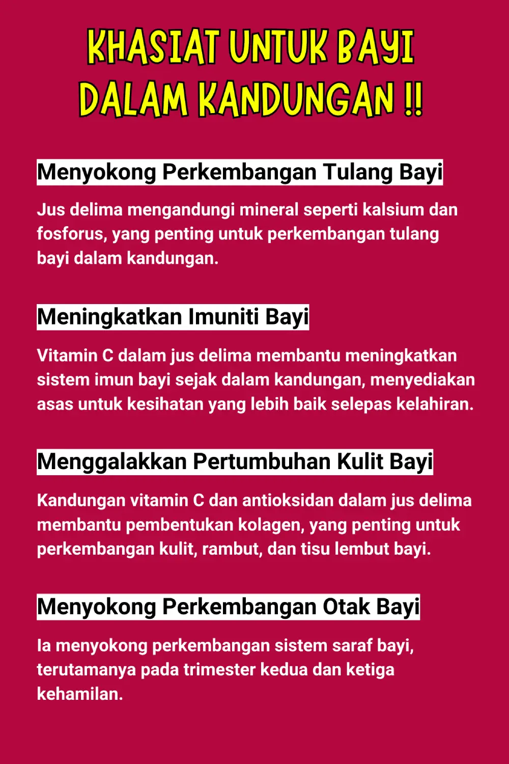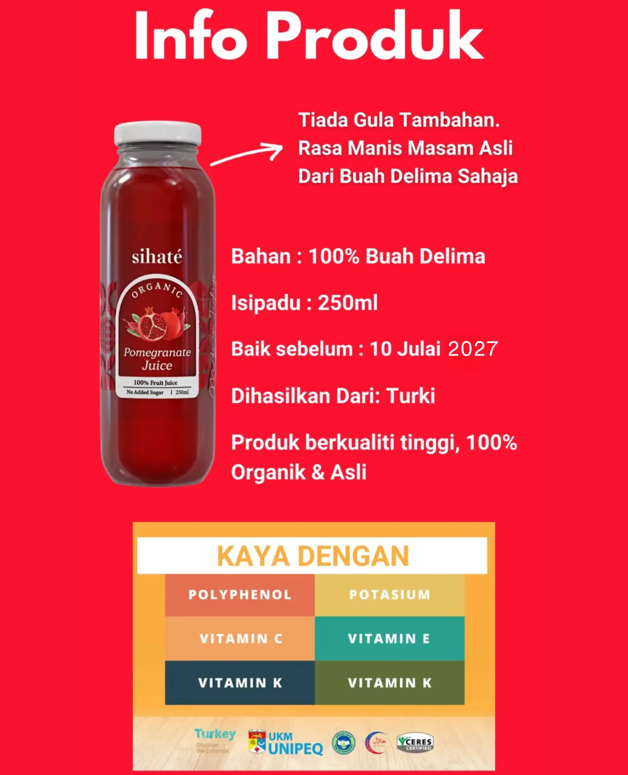 Gula yang terhasil di dalam jus ini merupakan gula semulajadi dari asal buah delima dan bukannya penambahan gula luar. Anda akan dapat menikmati rasa sebenar jus ini.